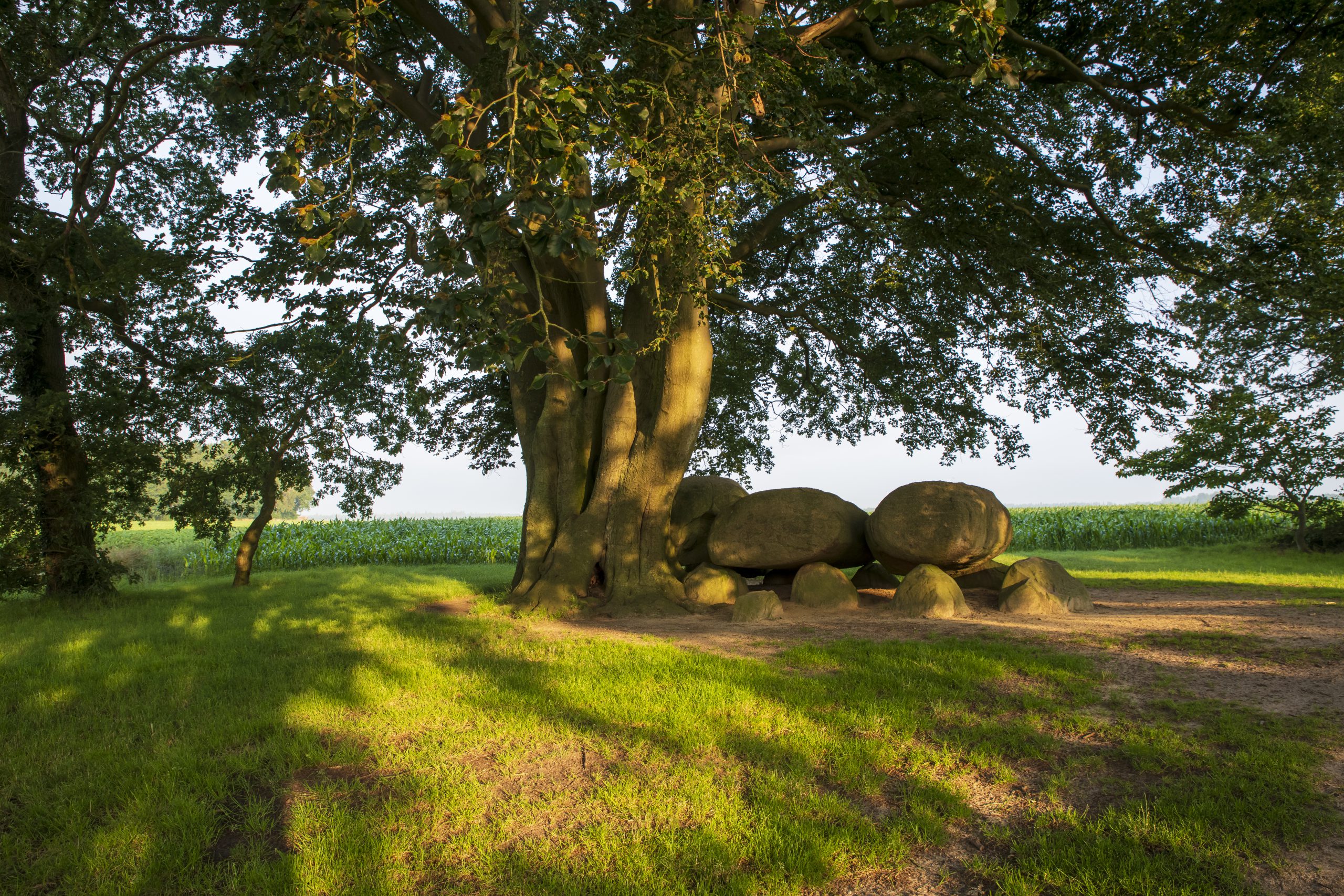 Wat deze hunebed extra bijzonder maakt, is de unieke plaatsing tegen de majestueuze boom. Deze symbiose tussen menselijke creatie en de natuurlijke wereld creëert een harmonieus tafereel. Het ruwe gesteente contrasteert prachtig met de organische vormen van de boom, waardoor een betoverende omgeving ontstaat die uitnodigt tot contemplatie.